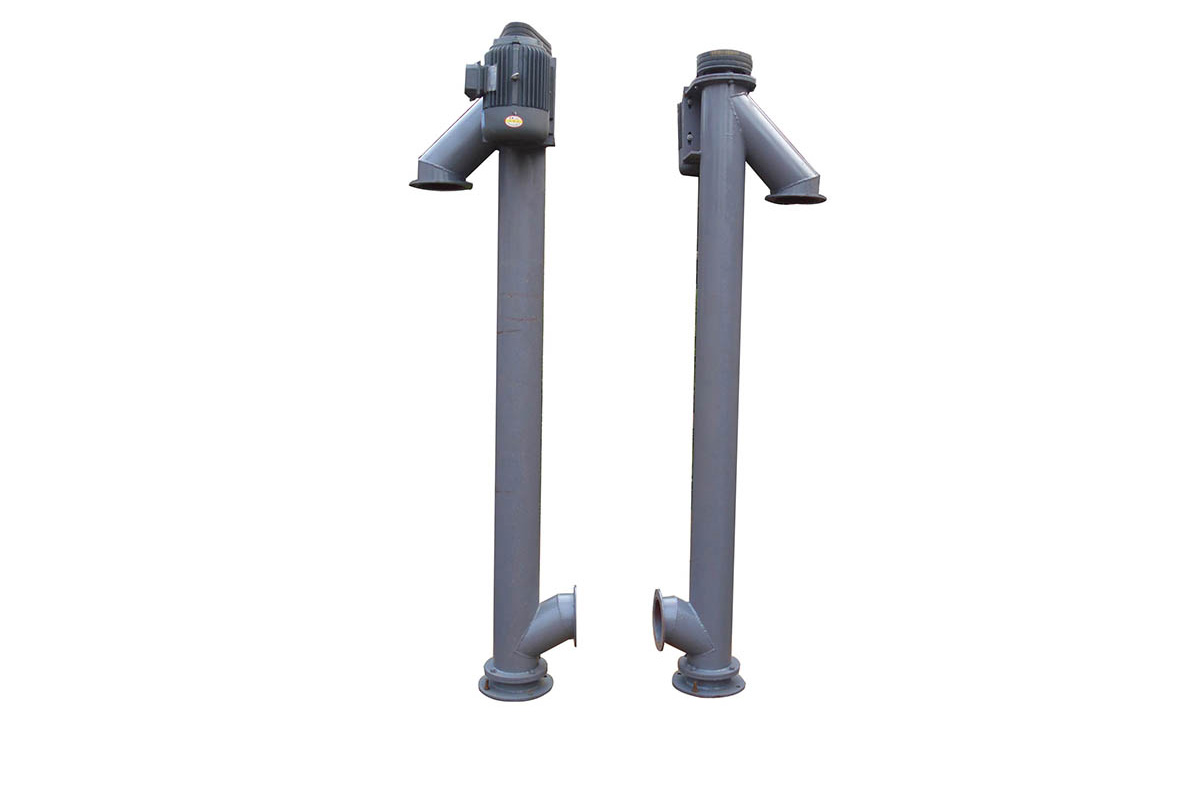 SZC系列垂直提升機(垂直輸送機)的驅動裝置振動電機安裝在輸送塔下部,兩臺振動電機對稱交叉安裝,輸送塔由管體和焊接在管體周圍的螺旋輸送槽組成,輸送塔座于減振裝置上,減振裝置由底座和隔振彈簧組成。當垂直輸送機工作時,根據雙振動電機自同步原理,由振動電機產生激振力,強迫整個輸送塔體作水平圓運動和向上垂直運動的空間復合振動,螺旋槽內的物料則受輸送槽的作用,作勻速拋擲圓運動,沿輸送槽體向上運動,從而完成物料的向上(或向下)輸送作業。