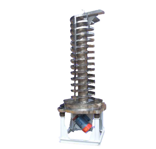 SZC系列垂直提升機(垂直輸送機)的驅動裝置振動電機安裝在輸送塔下部,兩臺振動電機對稱交叉安裝,輸送塔由管體和焊接在管體周圍的螺旋輸送槽組成,輸送塔座于減振裝置上,減振裝置由底座和隔振彈簧組成。當垂直輸送機工作時,根據雙振動電機自同步原理,由振動電機產生激振力,強迫整個輸送塔體作水平圓運動和向上垂直運動的空間復合振動,螺旋槽內的物料則受輸送槽的作用,作勻速拋擲圓運動,沿輸送槽體向上運動,從而完成物料的向上(或向下)輸送作業。